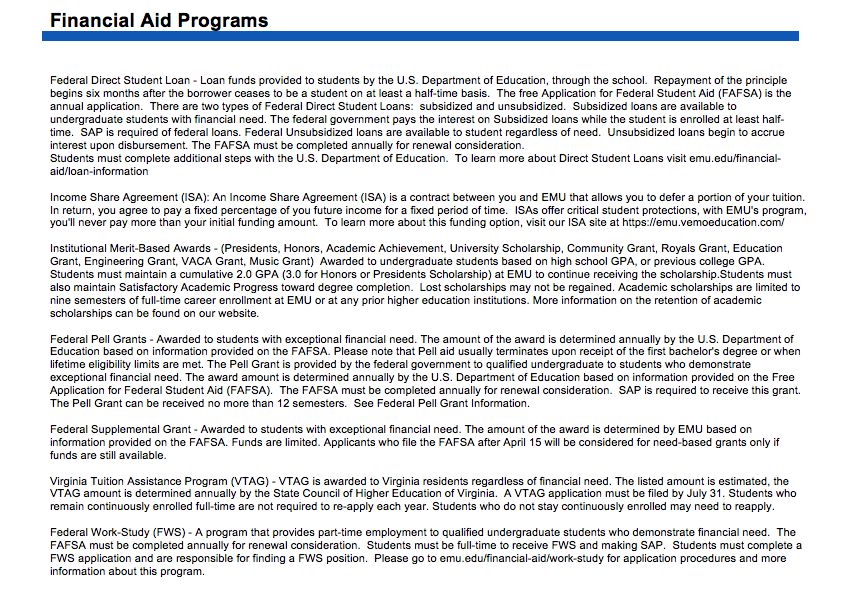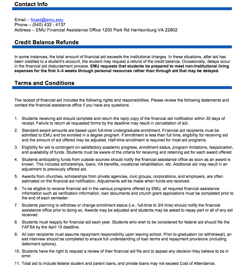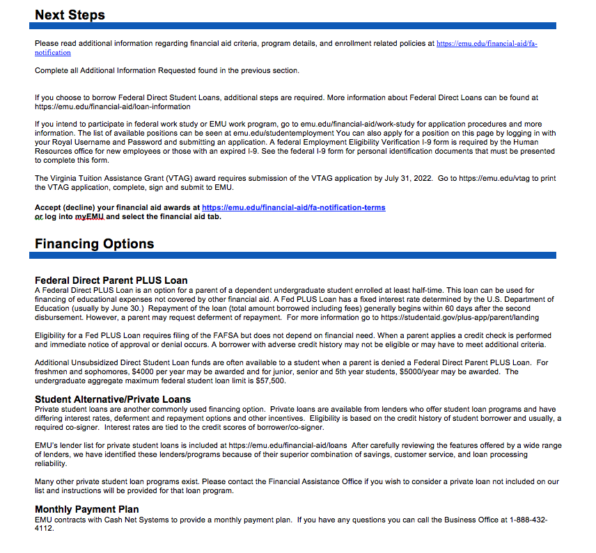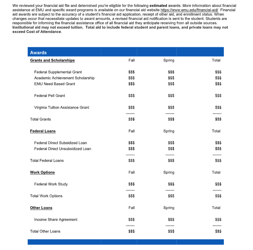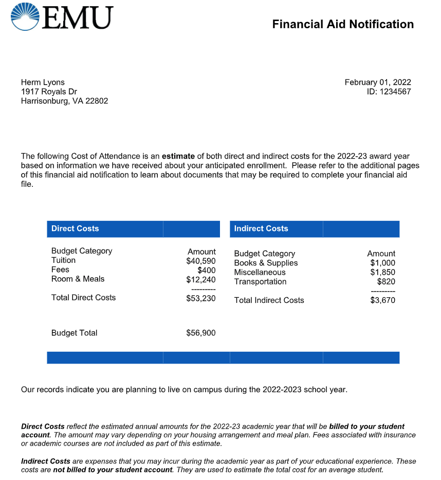 Every admitted student with a FAFSA on file at EMU can expect to receive an financial aid notification before enrollment. Your financial aid notification includes information on grants, scholarships and loans, as well as direct and indirect costs of an education at EMU. We want to make sure you understand all EMU has to offer related to financial aid.