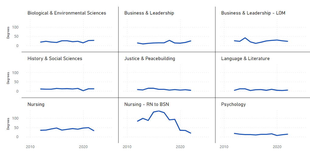 The degrees conferred section presents a 20+ year history of degrees and certificates conferred to EMU graduates, overall and by program area. Filtering is available on a variety of variables.
