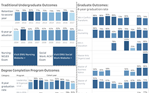 The student achievement page presents data on various outcomes of EMU's academic programs including retention, graduation, employment, and licensure pass rates.