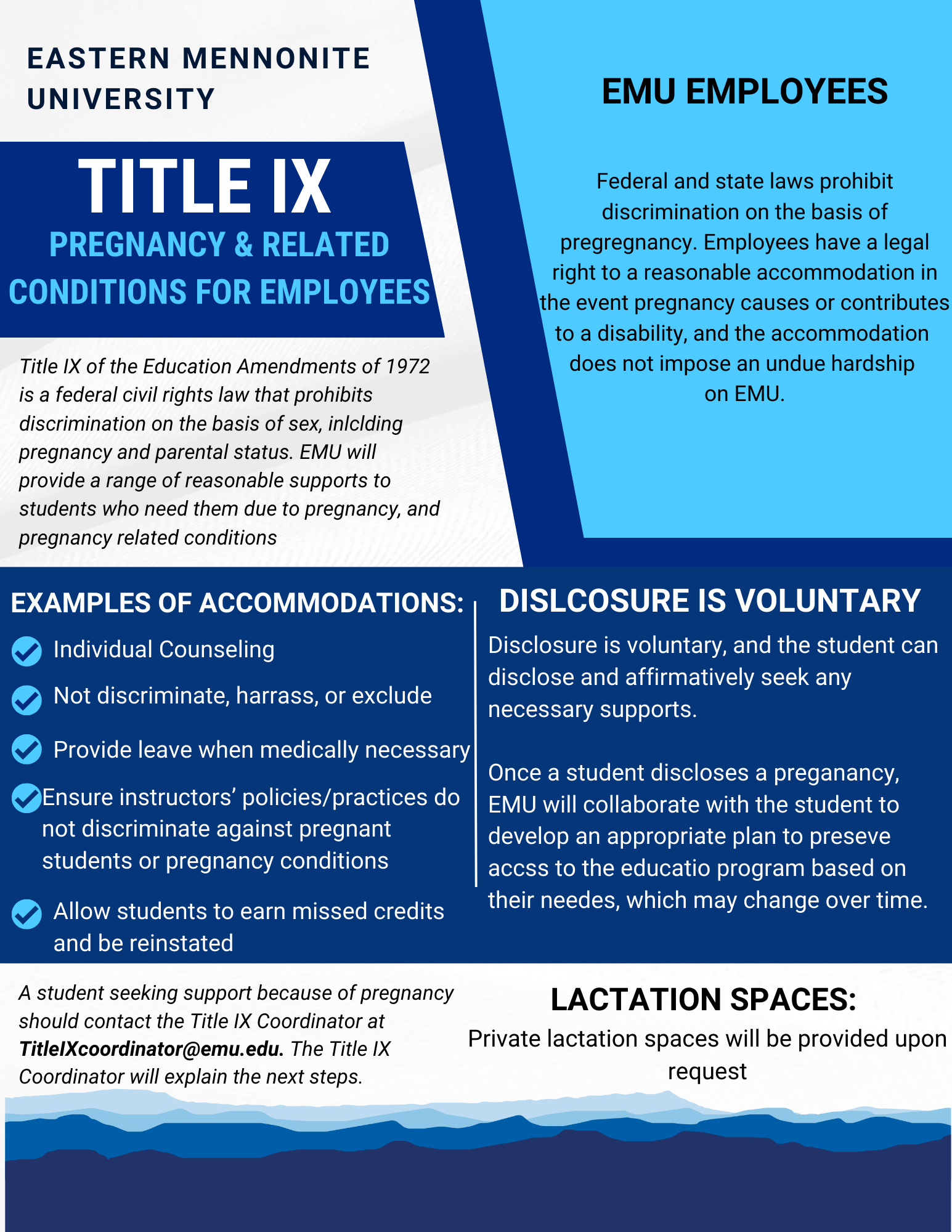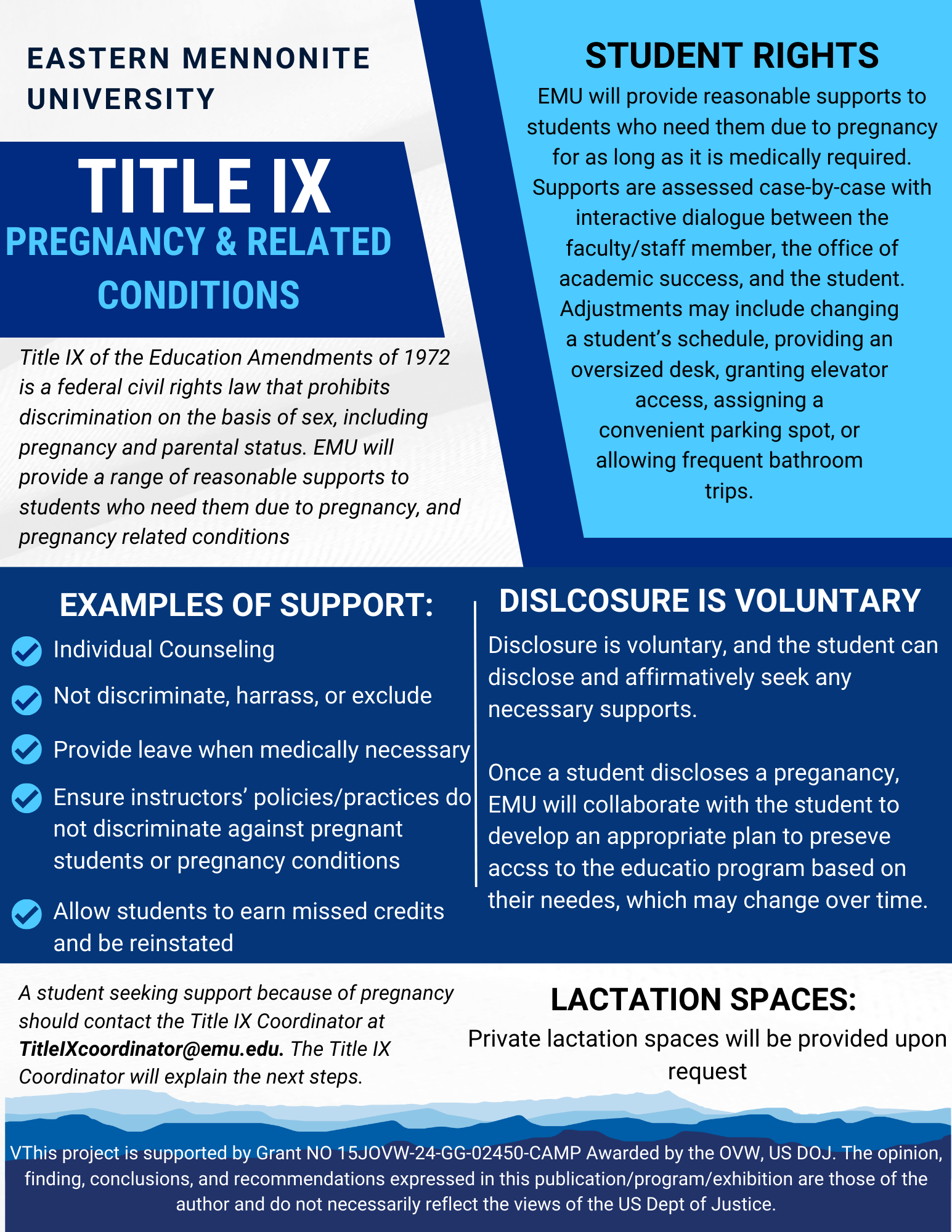 Eastern Mennonite University (EMU) is dedicated to fostering an inclusive and equitable community where all individuals are protected from discrimination, including on the basis of sex, as mandated by Title IX of the Education Amendments of 1972. This commitment extends to ensuring the fair treatment of pregnant persons, individuals with pregnancy-related conditions, and new parents, creating an environment of support and understanding.