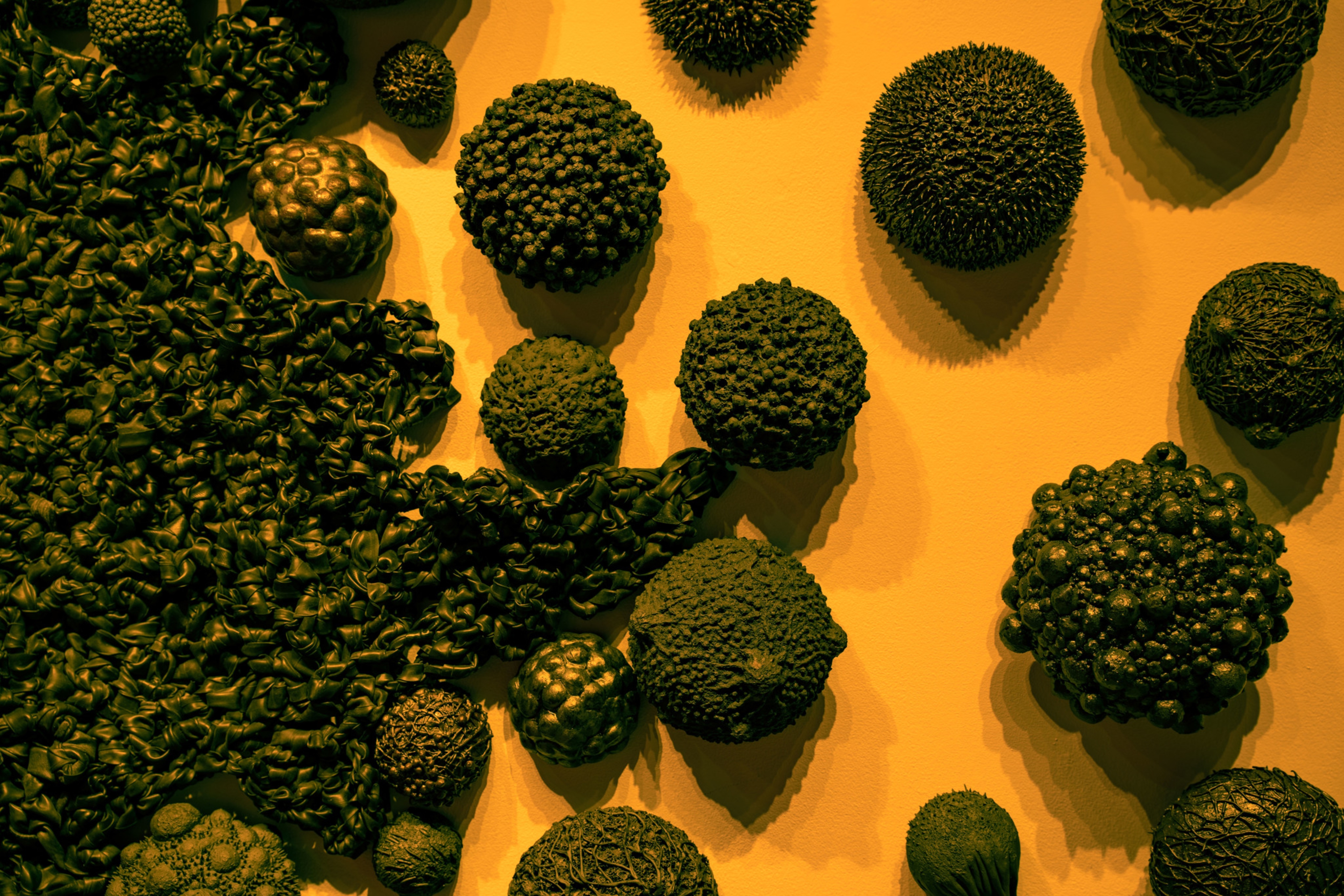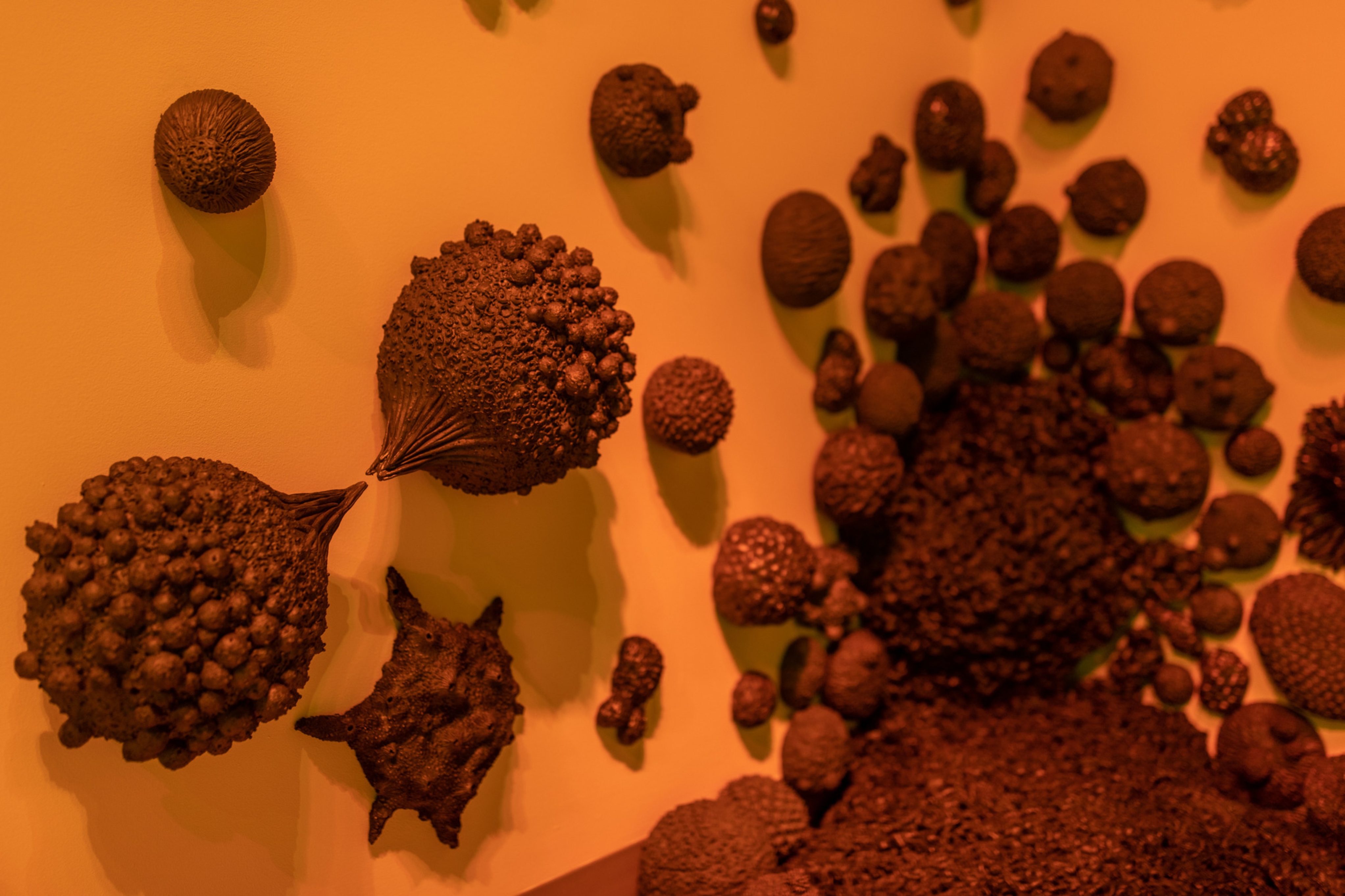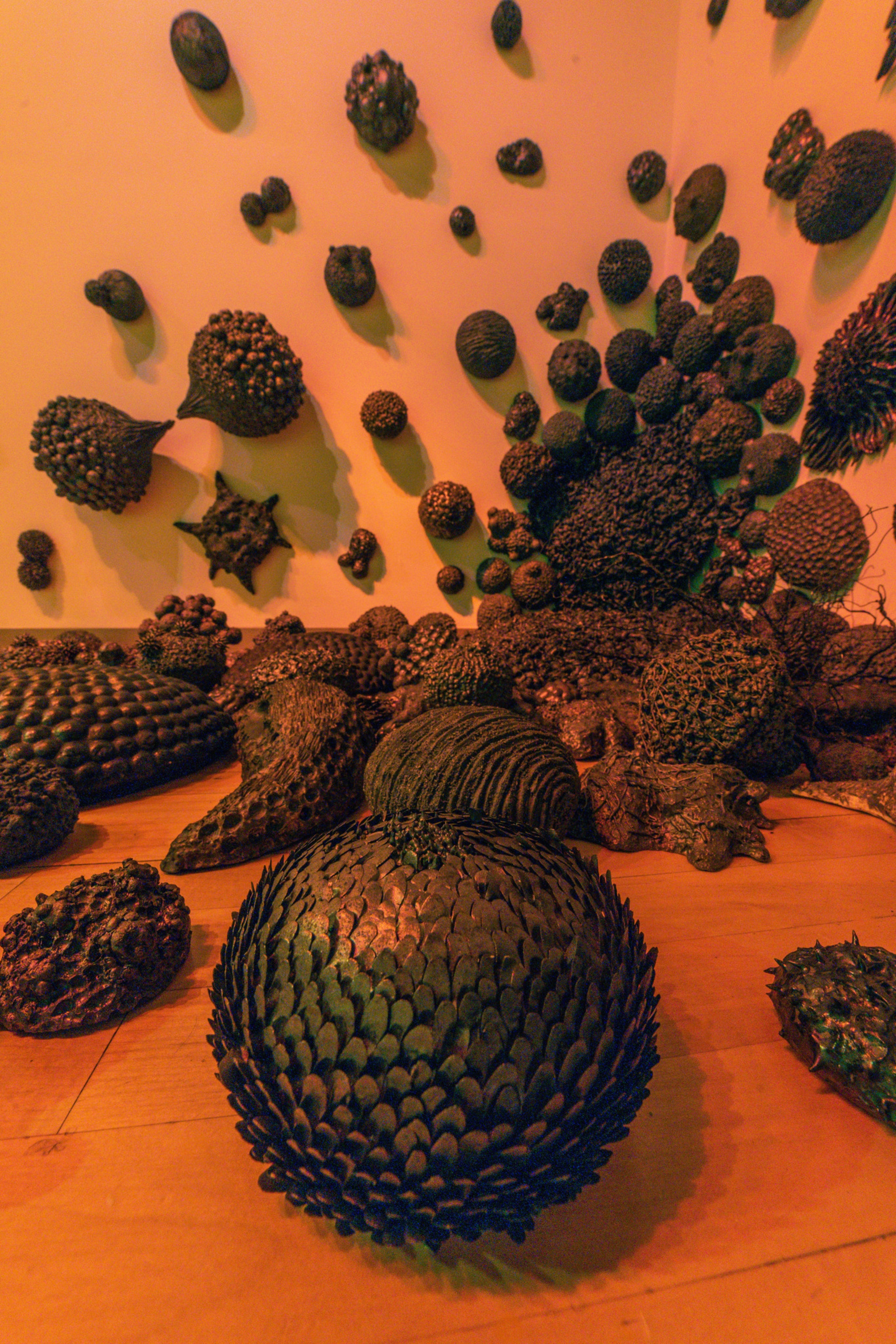 The dark ceramic sculptures give form to a fear heightened by the pandemic by taking the shape of microscopic images of disease cells, mutations, and viruses. Selected sculptures directly represent diseased cells, while others are inspired by characteristics of many different images suggesting an unknown potential hazard.