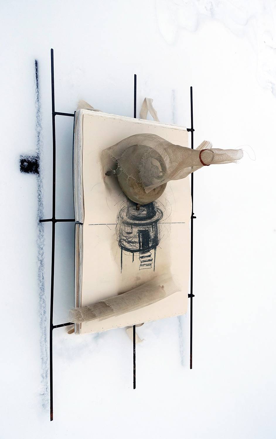 For the last four years, I have been creating handbound books as a record keeping of my thoughts. I fill them with stories about my work, readings, imaginations, and memories. I draw, paint and collage my photographs and other images onto the pages while working in silence, listening and breathing. John Cage said that deep listening creates a space of transformation capable of shattering complacency and despair. This intentional stillness can then infiltrate our imaginations (When Women were Birds by Terry Tempest Williams, p. 65). And each time I listen, I escape to another, surrealistic world.