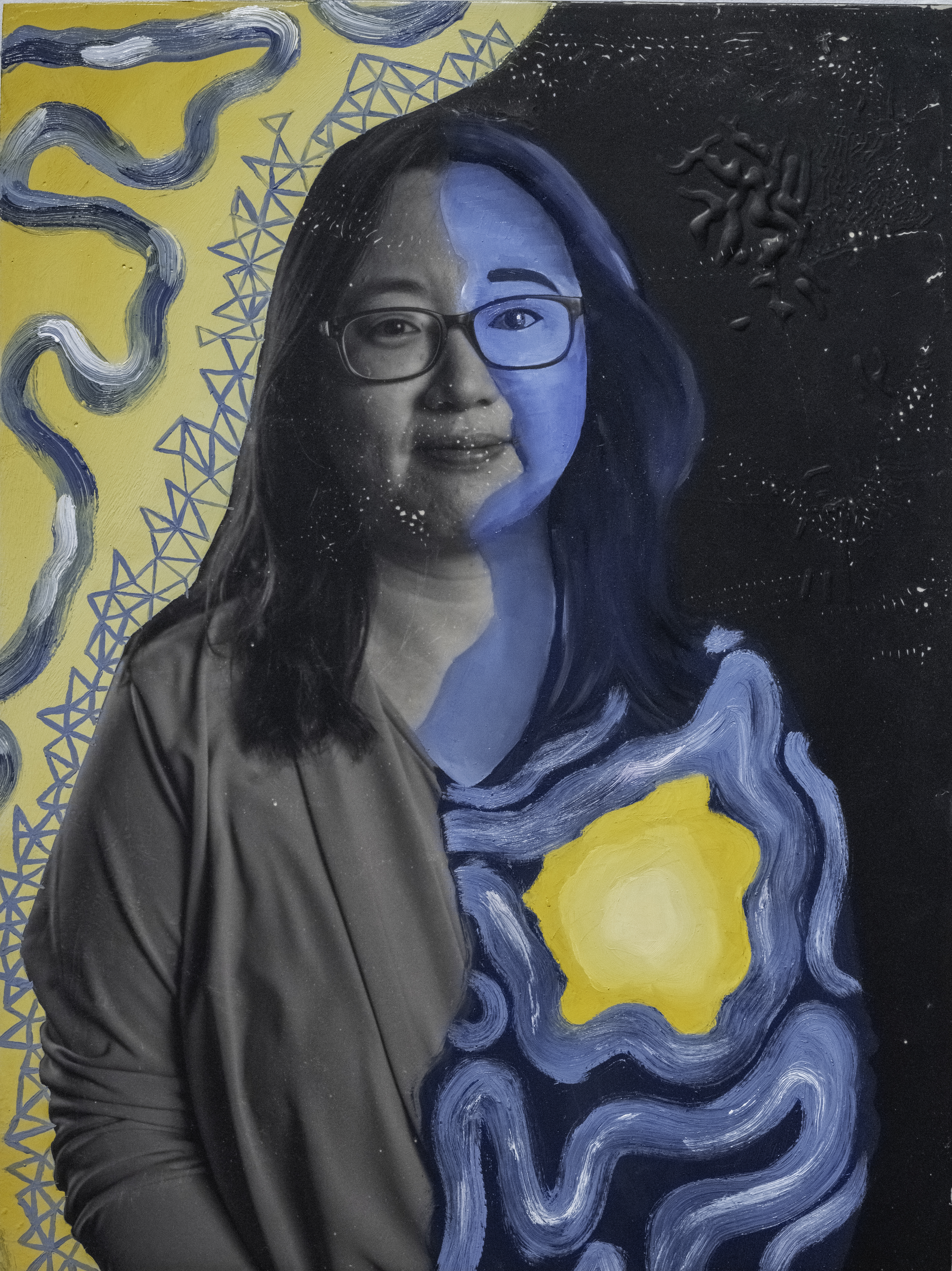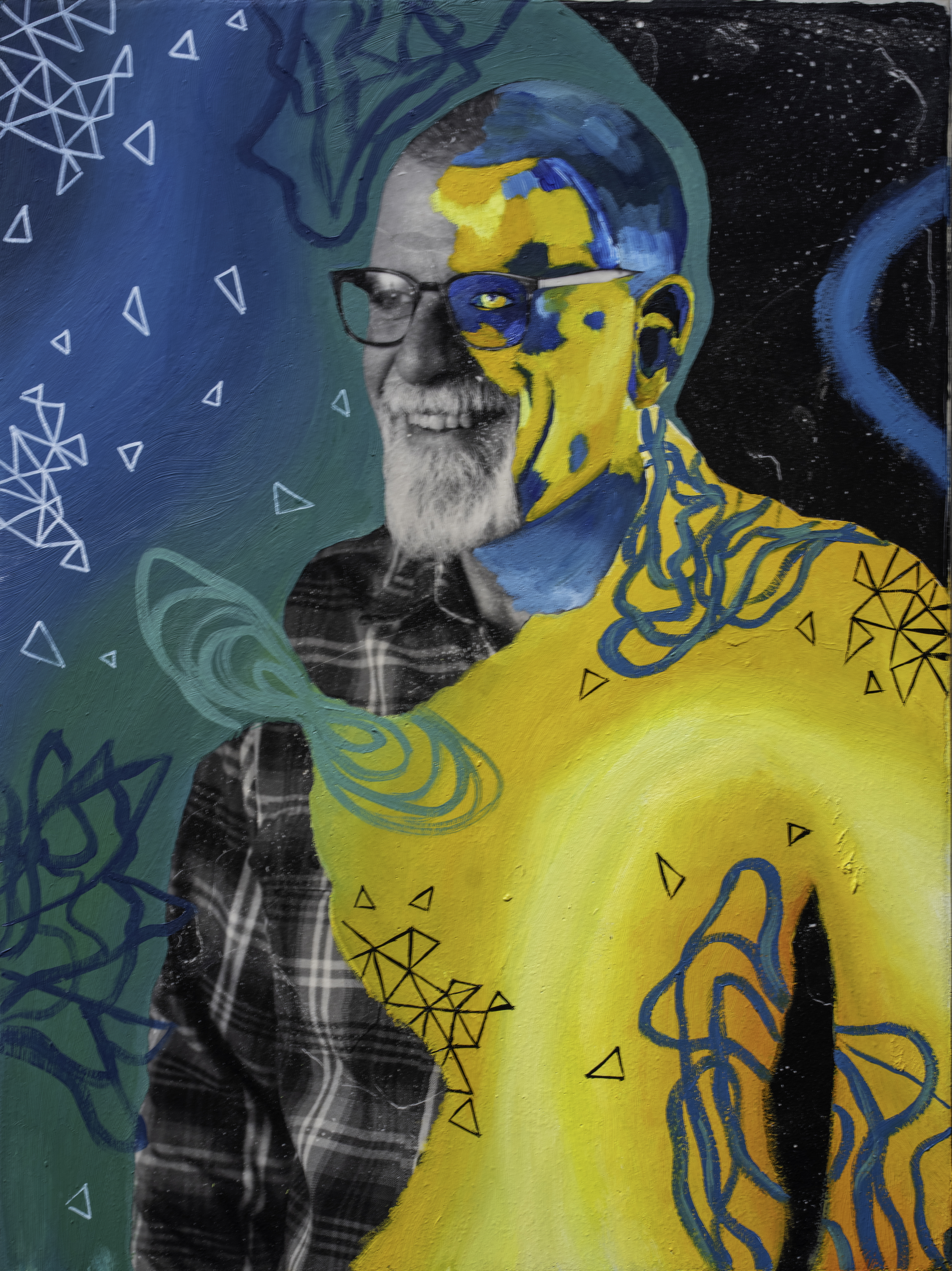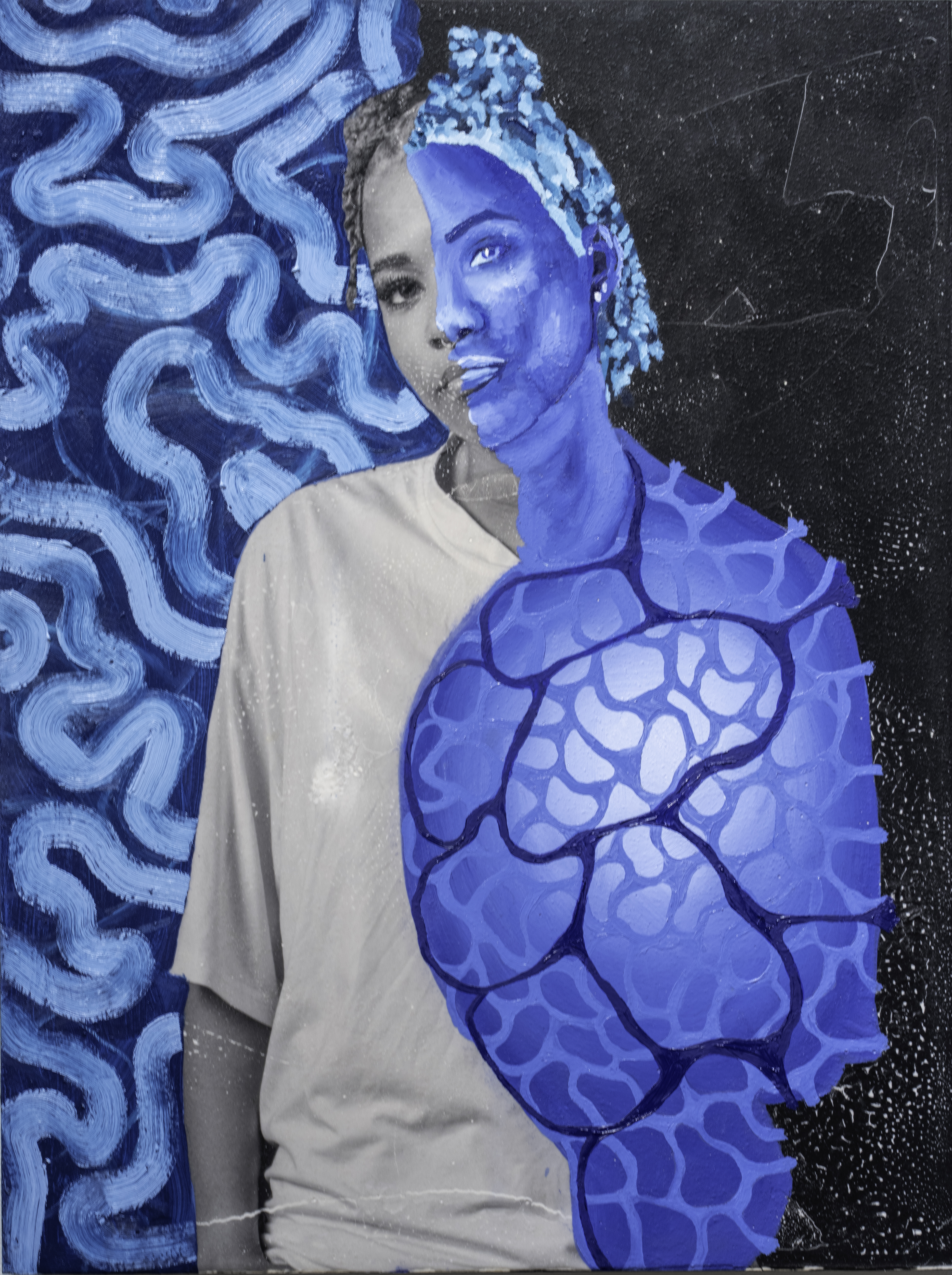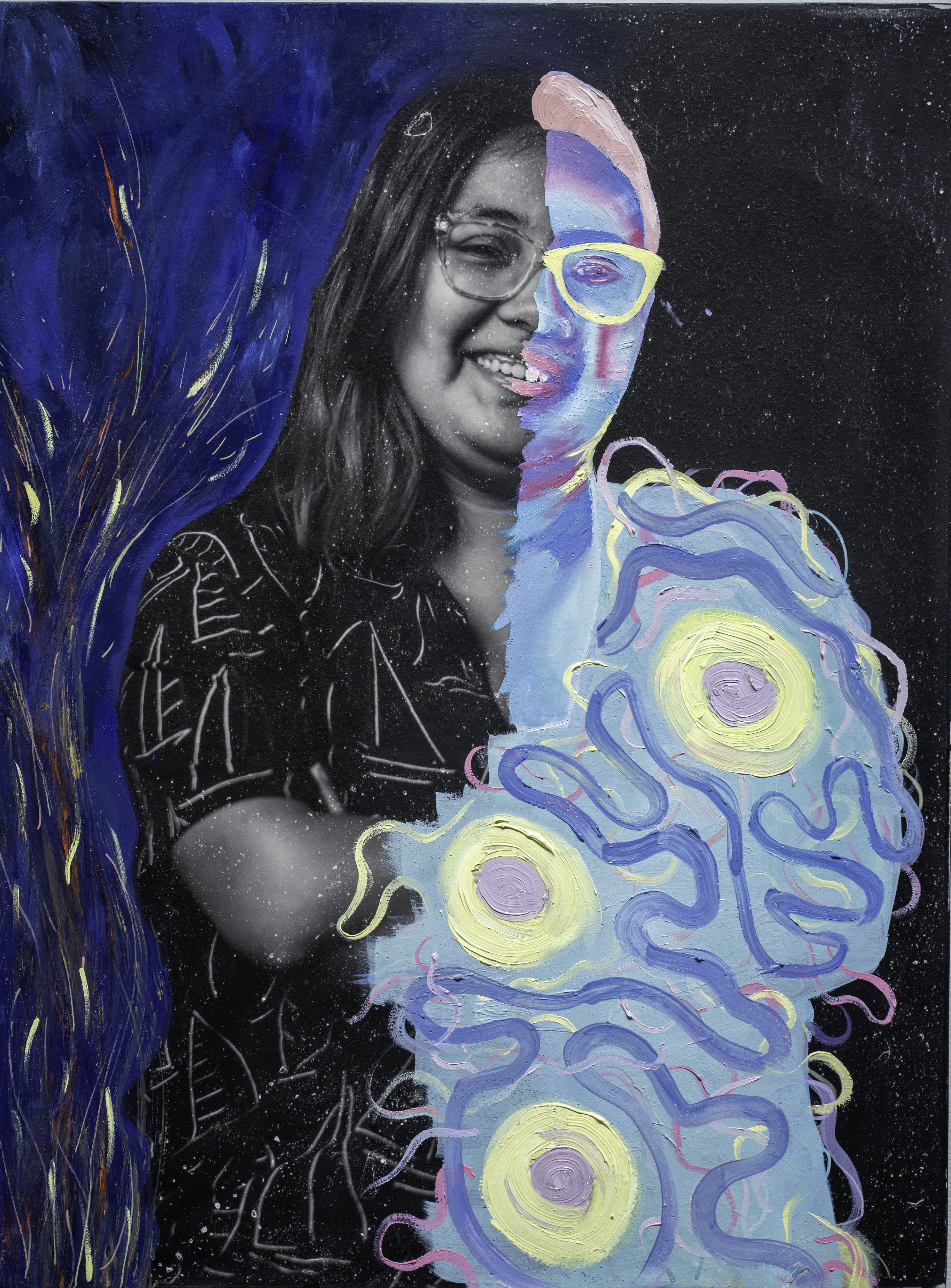 I blend traditional and contemporary techniques, beginning with a monochromatic studio photograph. Then I use an alternate-process "fresco" technique to transfer the image from plastic to wood (the image results are intentionally imperfect). I use my synesthetic intuition to transform the image into a conceptual composition. Using oil paints, markers, and other mixed media, I showcase the subject’s self-described internal and external identity, turning abstractions of my imagination into a tangible representation. I transfer each piece to a wooden canvas with the right side of the portrait revealing the individual’s unfiltered thoughts and the left narrowing how the individual believes others perceive them—a portrayal shaped by societal interactions and interpersonal dynamics."