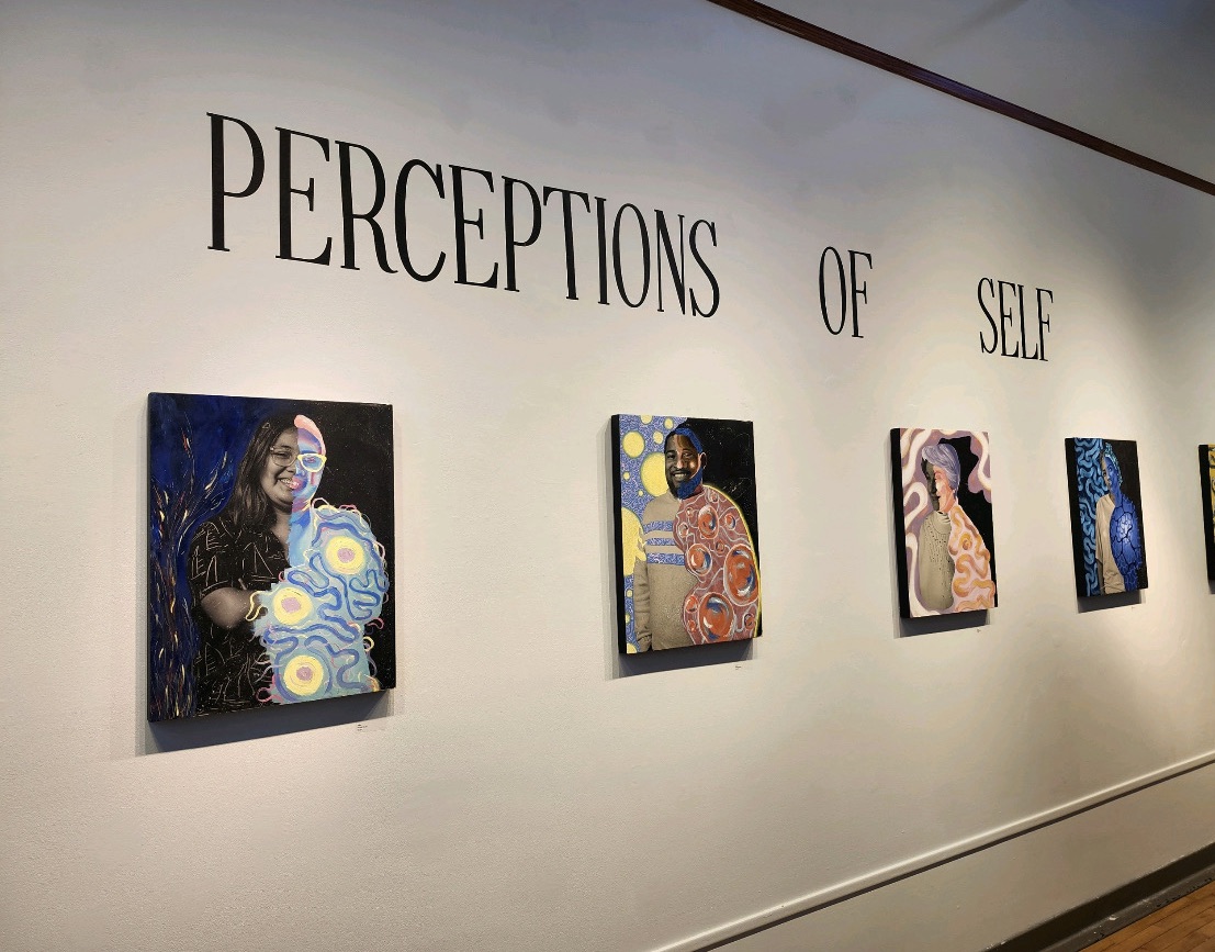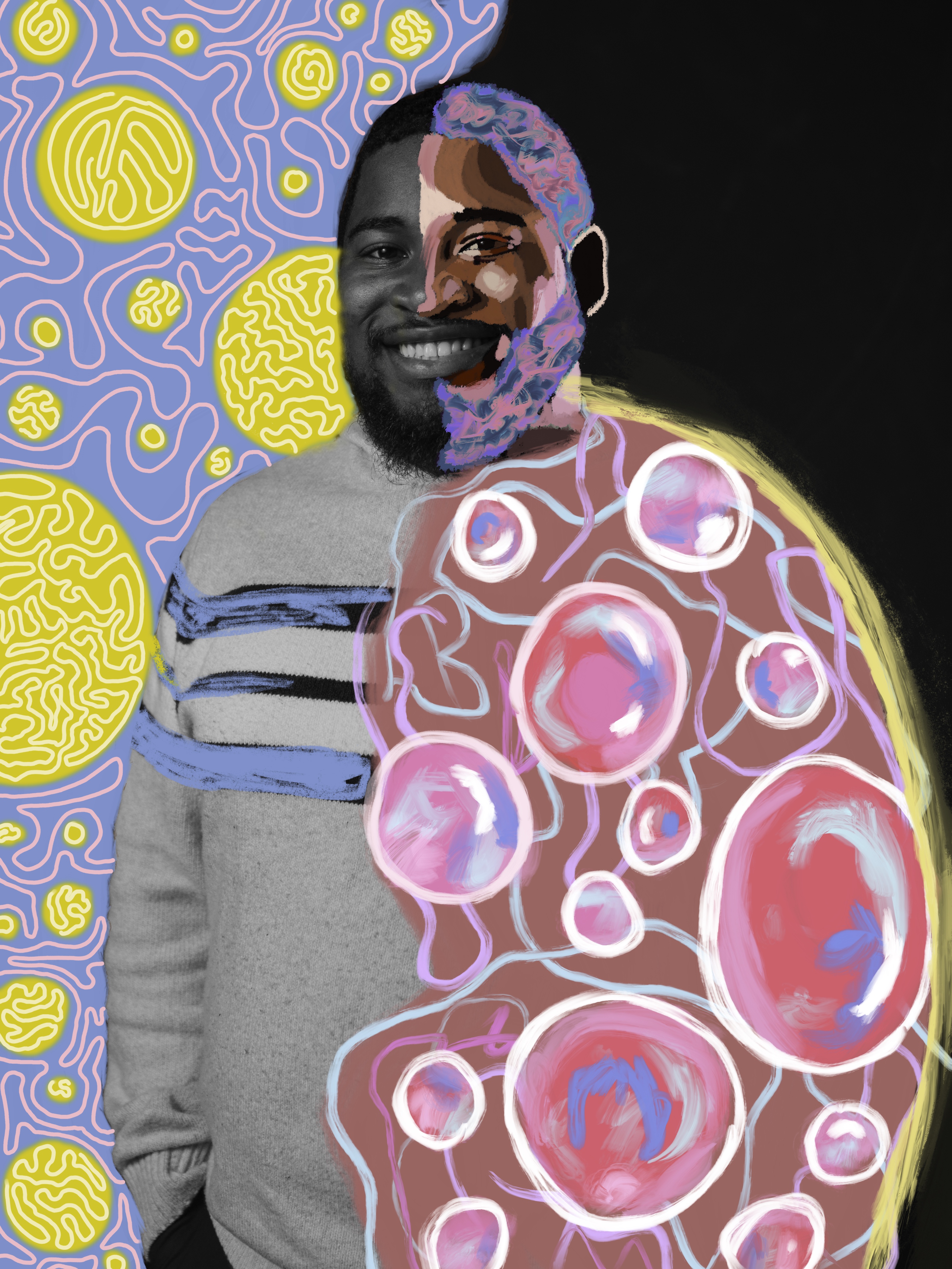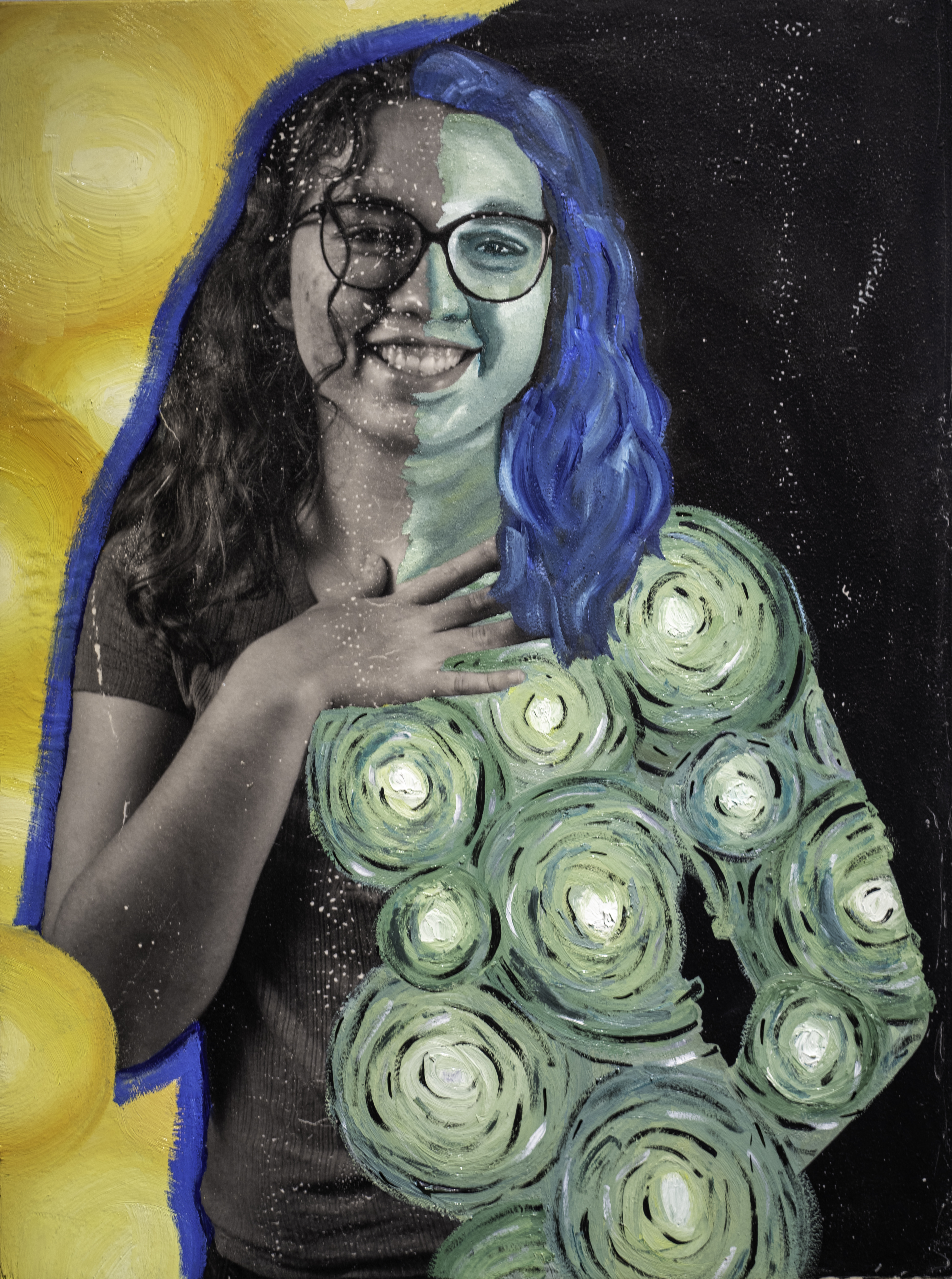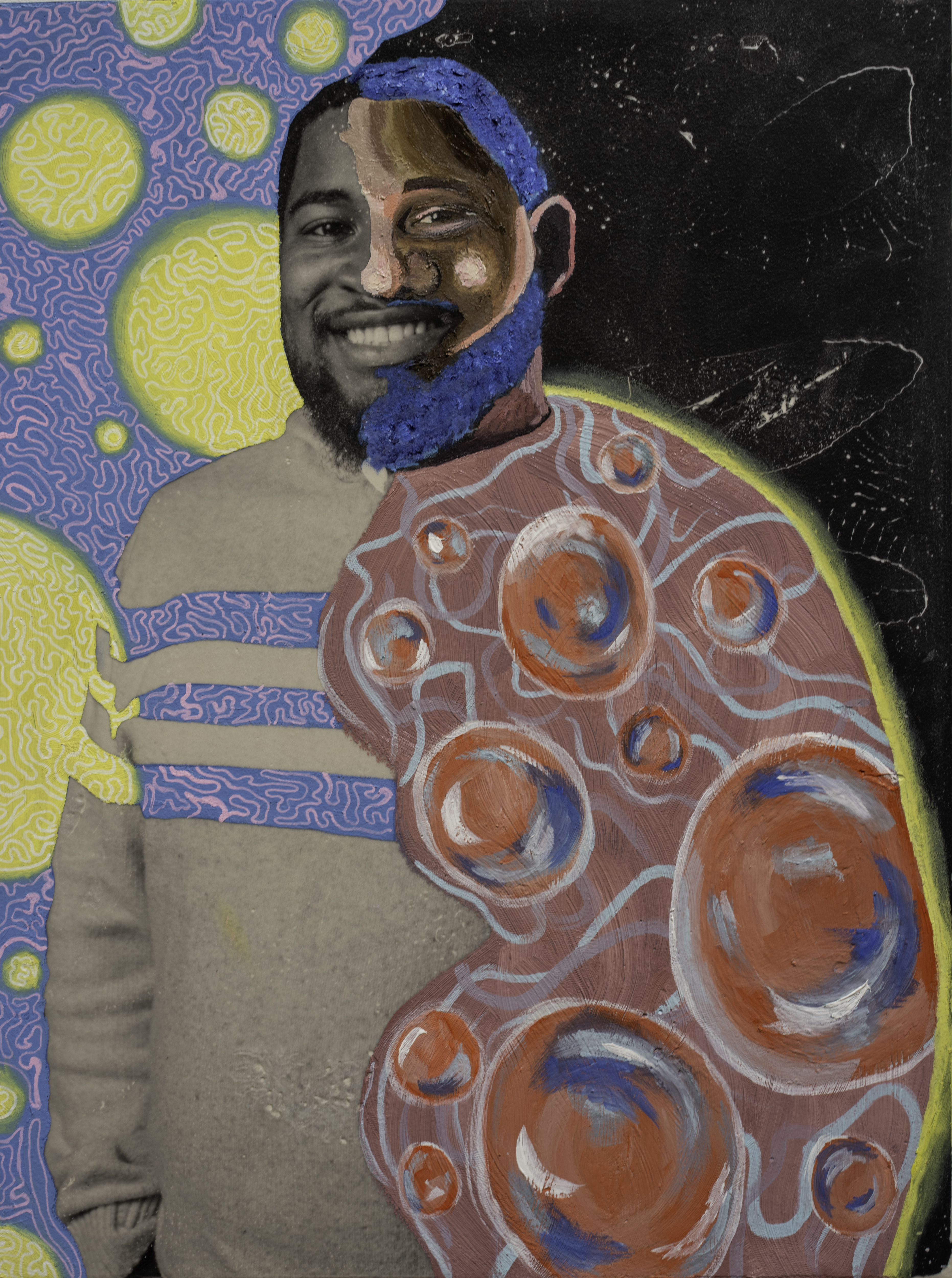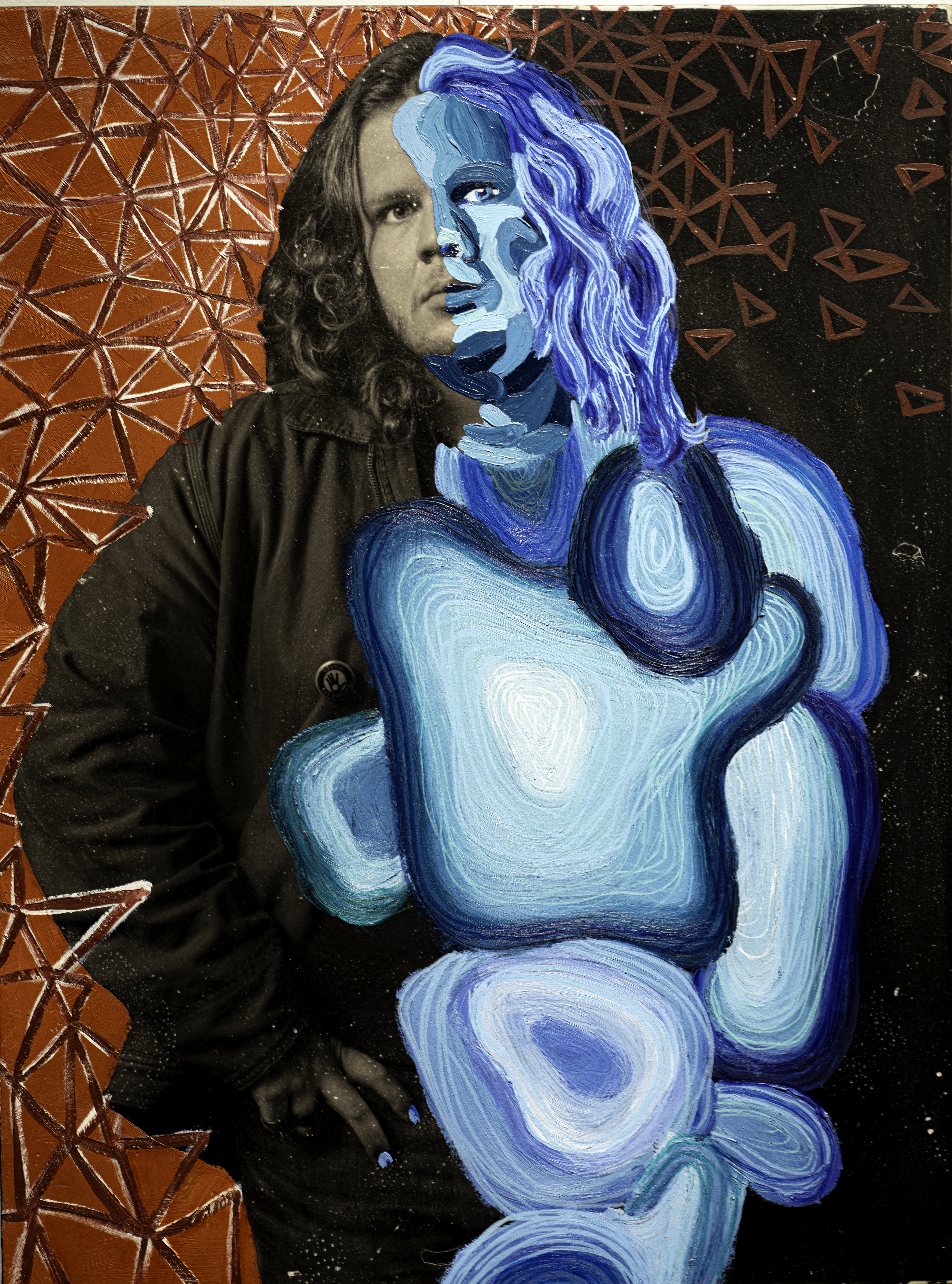 I blend traditional and contemporary techniques, beginning with a monochromatic studio photograph. Then I use an alternate-process "fresco" technique to transfer the image from plastic to wood (the image results are intentionally imperfect). I use my synesthetic intuition to transform the image into a conceptual composition. Using oil paints, markers, and other mixed media, I showcase the subject’s self-described internal and external identity, turning abstractions of my imagination into a tangible representation. I transfer each piece to a wooden canvas with the right side of the portrait revealing the individual’s unfiltered thoughts and the left narrowing how the individual believes others perceive them—a portrayal shaped by societal interactions and interpersonal dynamics."