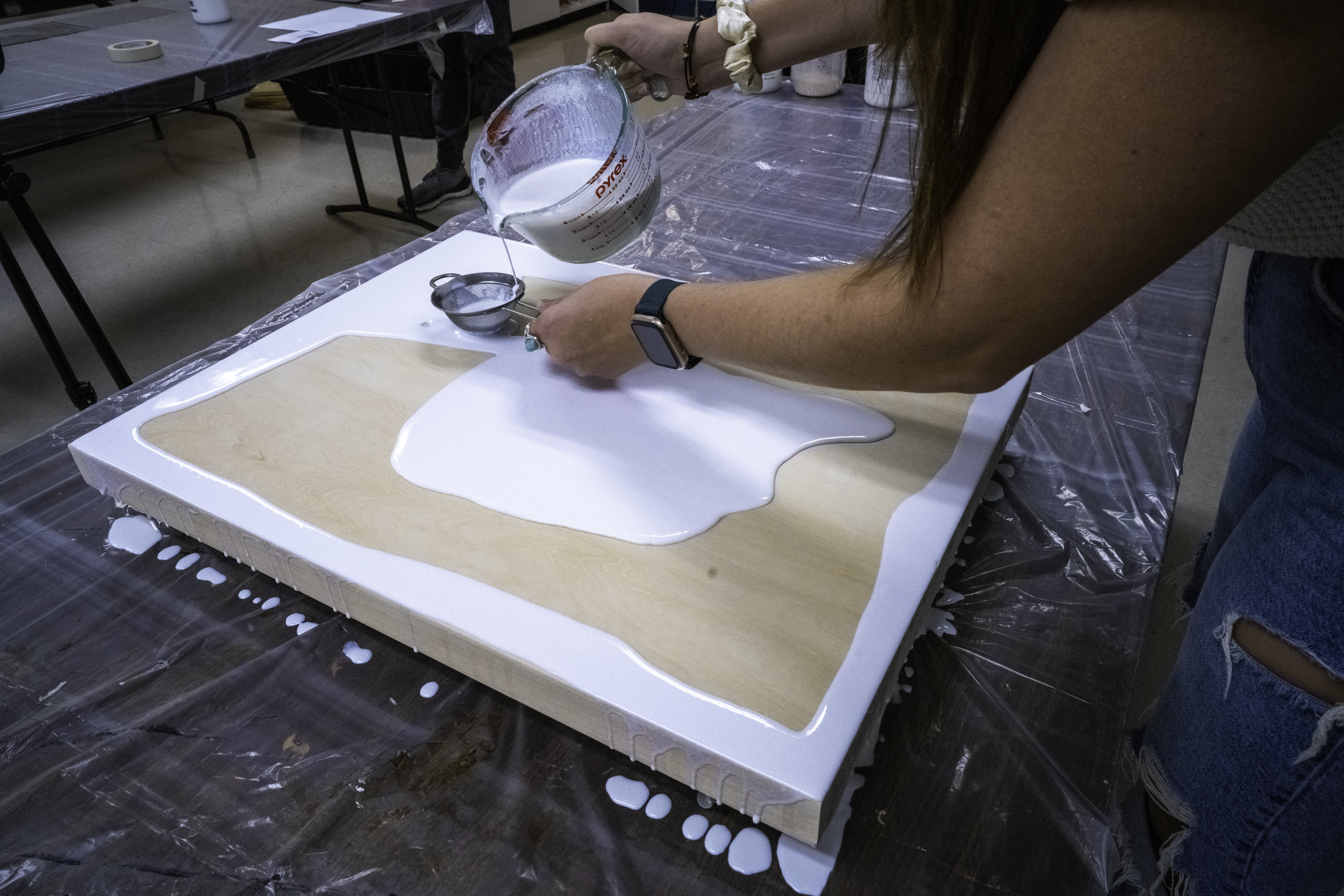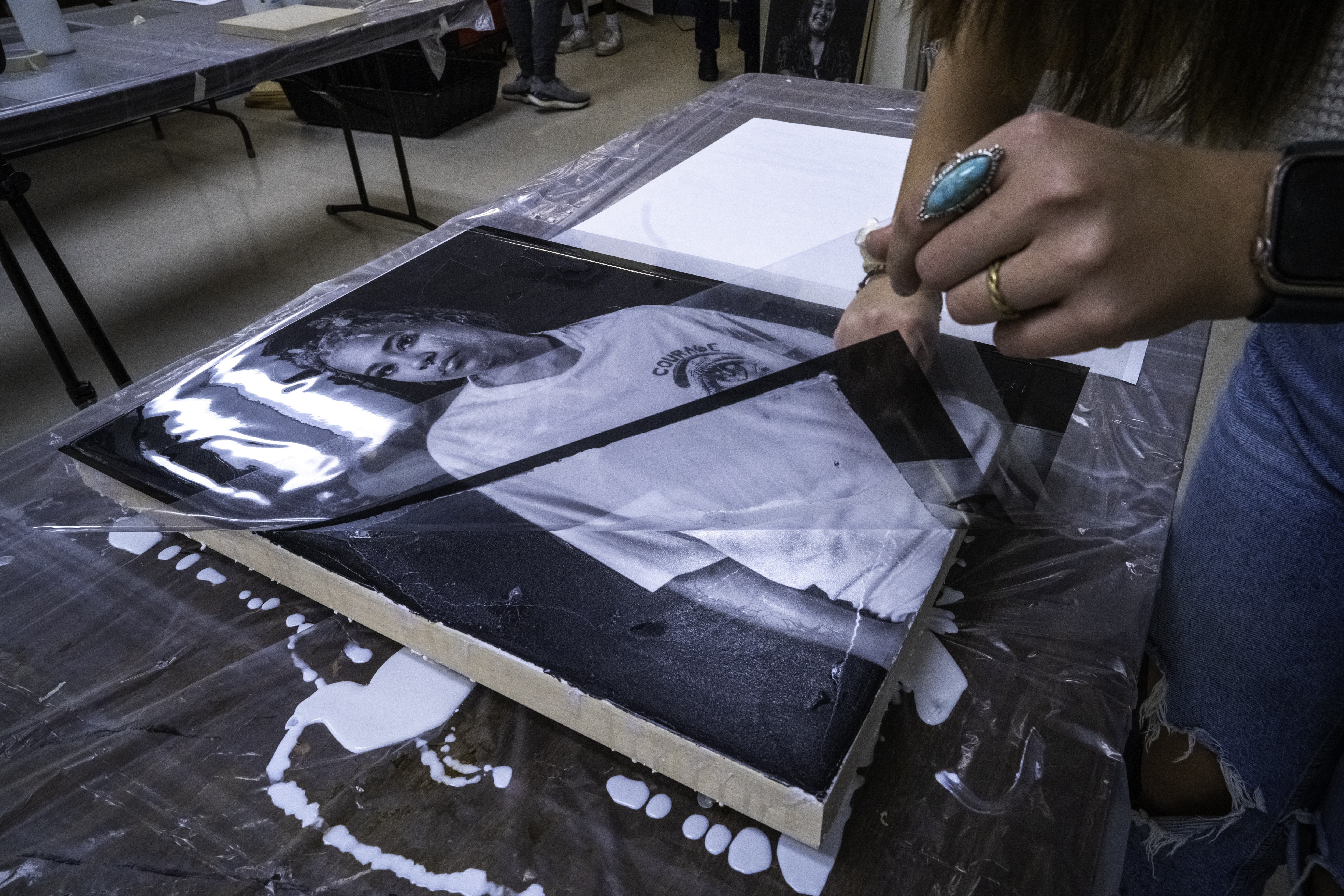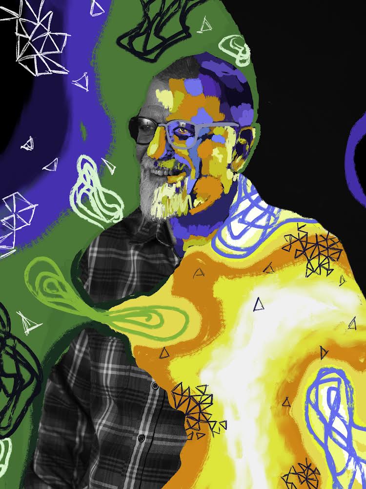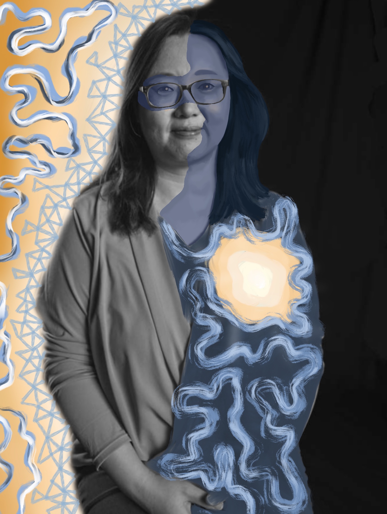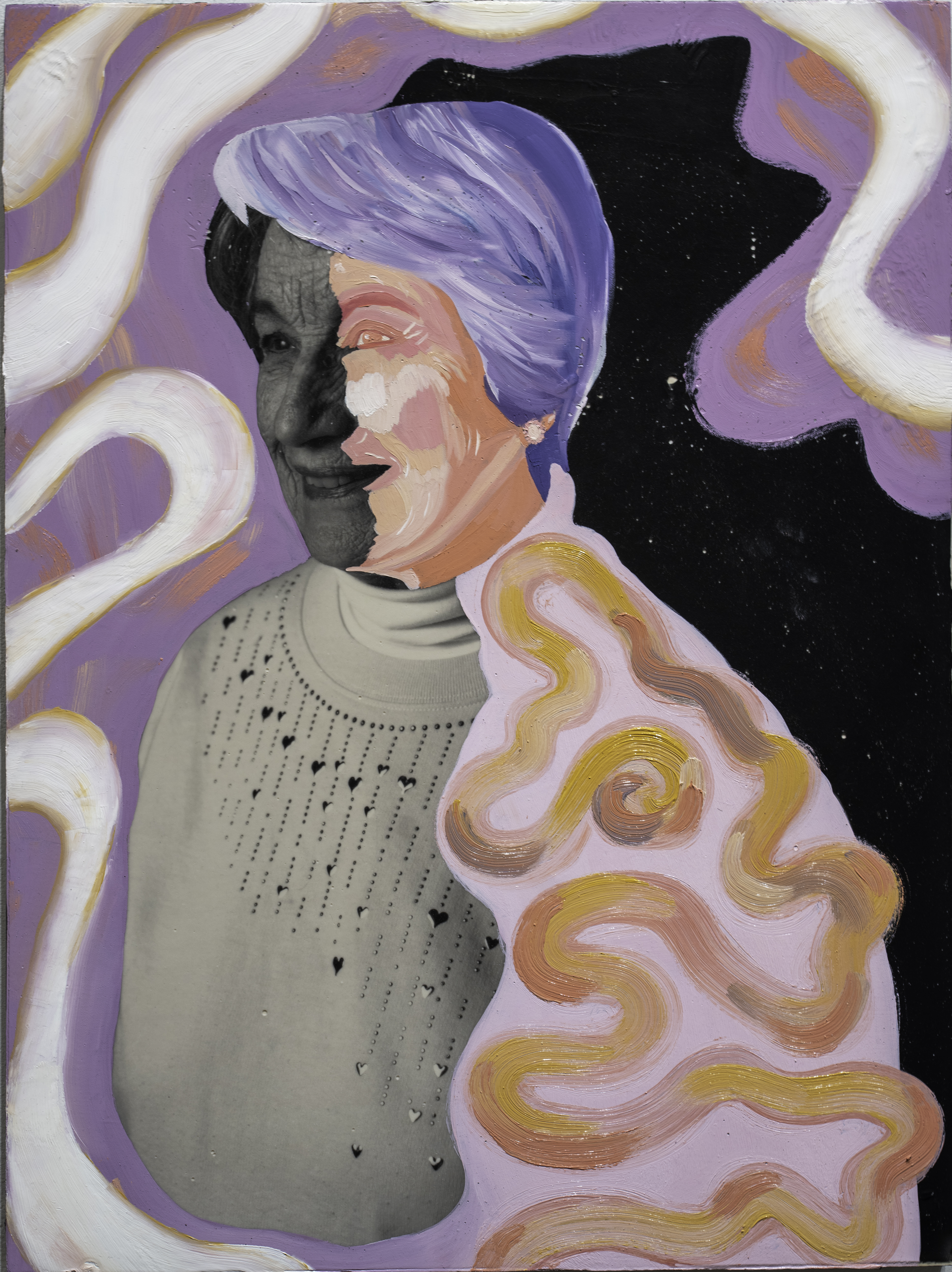 I blend traditional and contemporary techniques, beginning with a monochromatic studio photograph. Then I use an alternate-process "fresco" technique to transfer the image from plastic to wood (the image results are intentionally imperfect). I use my synesthetic intuition to transform the image into a conceptual composition. Using oil paints, markers, and other mixed media, I showcase the subject’s self-described internal and external identity, turning abstractions of my imagination into a tangible representation. I transfer each piece to a wooden canvas with the right side of the portrait revealing the individual’s unfiltered thoughts and the left narrowing how the individual believes others perceive them—a portrayal shaped by societal interactions and interpersonal dynamics."