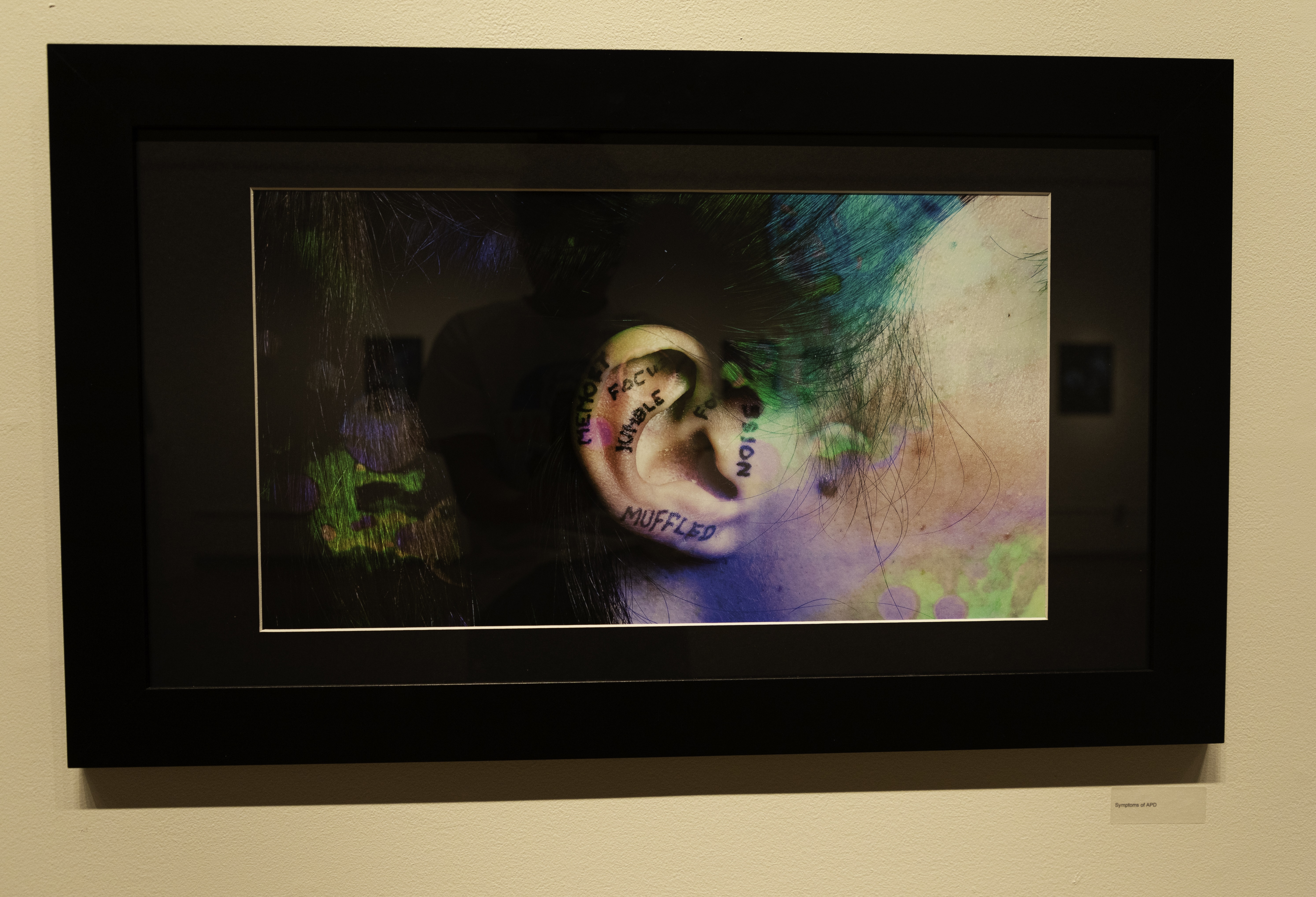 My exhibition shines a spotlight on a little-known learning disorder called Auditory Processing Disorder or APD. Picture yourself sitting in class. You are seven, perhaps eight years old, and you are petrified. Your brain can't hear. As sound travels through an imperfect pathway, words become jumbled, distorted, and incomprehensible. That was me! Testing proved it wasn't a hearing problem, ADHD, ADD, or Dyslexia, but “a breakdown in receiving, remembering, understanding, and utilizing information”, aka Auditory Processing Disorder.